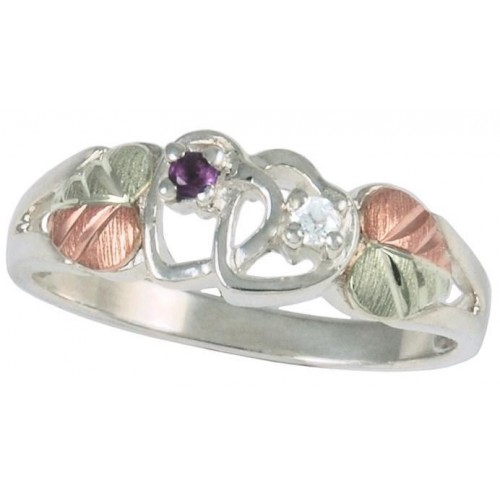 Genuine Diamond and Amethyst Stones in Double Heart with 12K Black Hills Gold Leaves on a Solid 10K Sterling Silver Band.